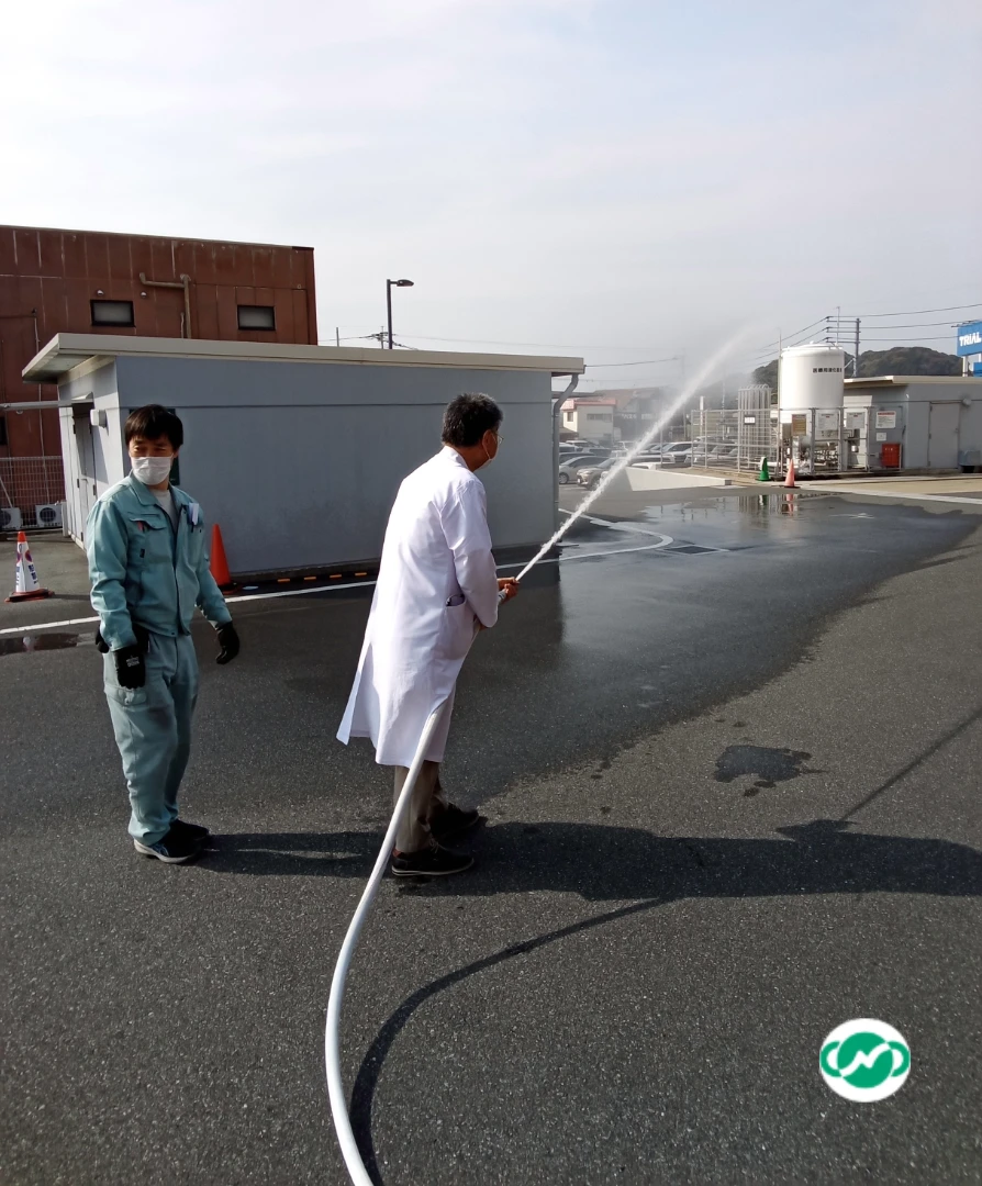 訓練終了後には、院長自ら消火器および消火ホースを使用した初期消火活動の体験を行い、実践的な対応力の向上を図りました。